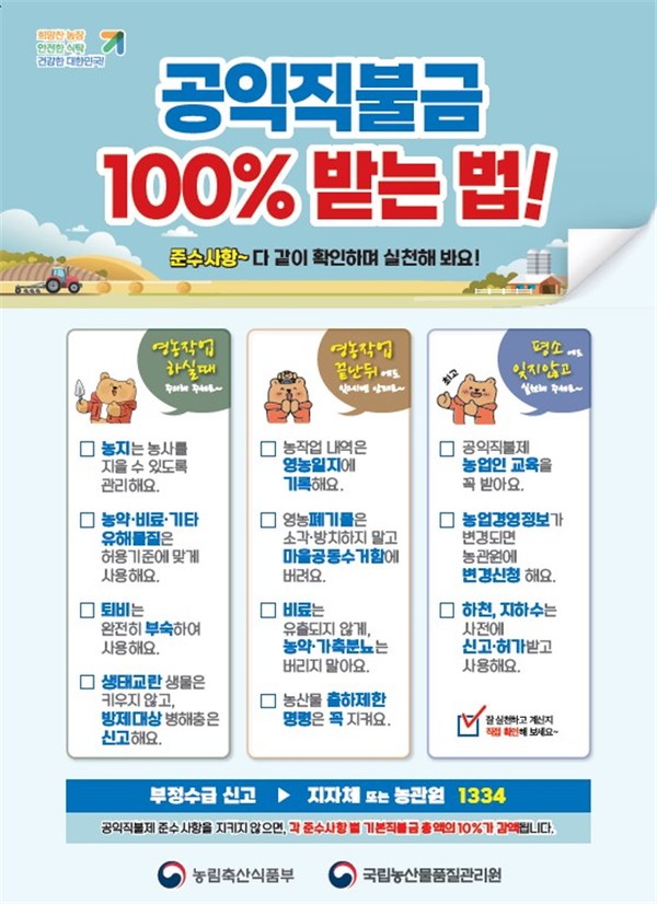 공익직불제는 농업․농촌의 공익적 기능을 증진하면서 농업에 종사하는 농업인의 소득 안정을 돕기 위해 직불금을 지원하는 제도로 농가가 직불금을 100% 받기 위해서는 법령에 정해진 16가지 의무 준수사항을 모두 실천해야 한다.