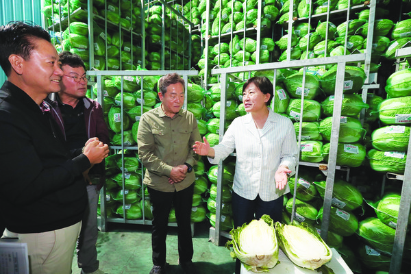고랭지에서 재배되는 여름배추는 폭우·폭염 등에 매우 취약해 각별한 관리가 필요하다. 송미령 농림축산식품부 장관<오른쪽>이 6일 대관령원예농업 배추 출하조절시설 점검하고 있는 모습.