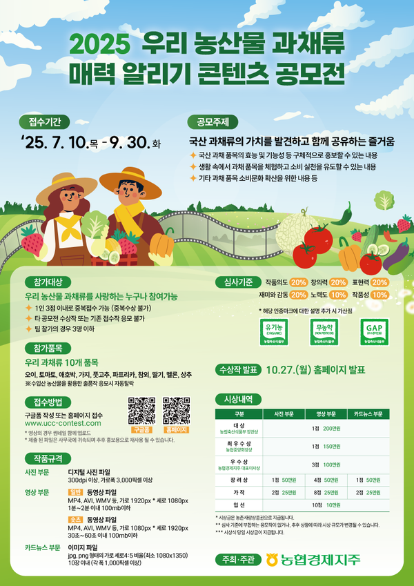 농협경제지주는 국산 과채류의 우수성을 알리고 소비를 확대하기 위해 ‘2025 우리 농산물 과채류 매력 알리기 콘텐츠 공모전’을 개최한다.