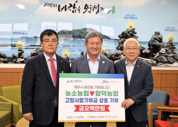 농소농협(조합장 정성락, 사진·왼쪽)은 지난 10일 제주시장(시장 김완근, 사진·가운데) 집무실을 방문해 제주 함덕농협(조합장 현승종, 사진·오른쪽)과 함께 ‘고향사랑기부금 상호 기탁식’을 가졌다.