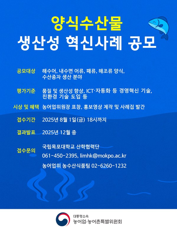 대통령소속 농어업·농어촌특별위원회(이하 농어업위)는 고수온과 같은 해양환경 변화와 생산비 증가 등으로 어려움을 겪고 있는 양식어업의 위기 극복을 위해 ‘양식수산물 생산성 혁신 사례’ 공모를 다음 달 1일까지 진행한다.