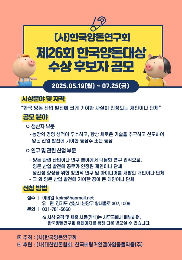 한국양돈연구회(회장 안근승)가 주최하고 대한한돈협회(회장 손세희), 한국베링거인겔하임동물약품(대표 서승원)이 후원하는 제26회 한국양돈대상 후보자 추천 마감이 오는 25일까지 연장됐다.