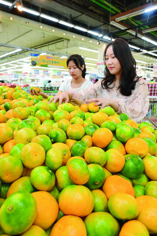 폭염과 무더위가 지속되는 가운데 겨울 과일 귤이 매대에 올랐다. 농협유통은 지난 13일 농협하나로마트 양재점에서 제주 시설재배로 출하된 감귤을 선보였다. [농협유통 제공]