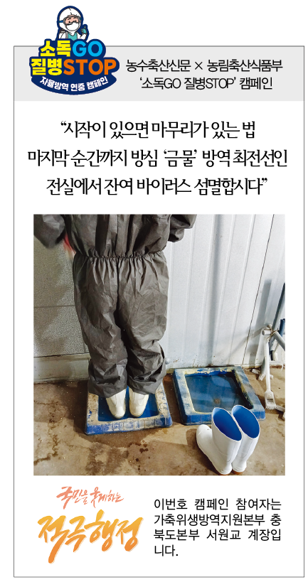 [농수축산신문=농수축산신문] 이번호 캠페인 참여자는 가축위생방역지원본부 충북도본부 서원교 계장입니다. 농수축산신문 webmaster@aflnews.co.kr 다른기사 보기 저작권자 © 농수축산신문 무단전재, 재배포 및 AI학습 이용 금지 당신만 안 본 뉴스 [AFL칼럼] ASF 백신 개발, ‘K-방역’의 새 지평 열까 서울 영등포농협 사회공헌실천재단, '가정의 달 이벤트' 경품 증정식 개최 예산군, ‘힐링·건강·나눔’으로 주민 삶의 질 높인다 영등포농협 사회공헌실천재단, 동작구 '사랑의 온도탑' 제막식 '1호 주자'로 나서 지역사회 온기 확산 물꼬 터 차기 농협 축산경제 대표이사 선거 3파전 영농형태양광, 임차농 보호장치 마련을…정부, 투기 방지법 ‘밑그림’ [Issue+] 2026 국제곡물시장 전망 [AFL칼럼] ASF 백신 개발, ‘K-방역’의 새 지평 열까 댓글삭제 삭제한 댓글은 다시 복구할 수 없습니다. 그래도 삭제하시겠습니까? 비밀번호 닫기 기사 댓글 0 댓글 접기 로그인 후 이용 가능합니다. 댓글 내용입력 비회원 로그인 이름 비밀번호 댓글 내용입력 댓글쓰기 계정을 선택하시면 로그인·계정인증을 통해 댓글을 남기실 수 있습니다. 회원 로그인 비회원 글쓰기 이름 비밀번호 자동등록방지 로그인 옵션 창닫기 주요기사 숭례문 앞에 모인 ‘유령농부’들…유기농업 2배 확대 결의 플랜티팜, 사우디 성지 메디나에 K-스마트팜 구축한다 산림경영지도 우수사례 최우수상에 이이섭 상주시산림조합 지도원 세포배양 인조축산물, 안전성 문제 여전히 화두 [Issue+] 지속가능한 농업은 우리의 사명...ESG 경영 발굴·확산 ‘주목’ [농수축산신문-수협중앙회 공동기획] 착용海요 구명조끼 안전海요 우리바다 ⑦ 제주시 이보라 조일호 선장