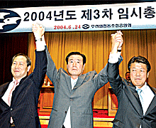 지난 24일 실시된 수협중앙회장 보궐선거는 역대 어떤 선거보다 깨끗하게 치러진 것으로 평가를 받은 가운데 박종식 후보가 새 회장으로 당선됐다. 사진은 당선된 박종식 회장(가운데)이 낙선한 김삼만(영일수협장·왼쪽)·박학순(경기남부수협장·오른쪽) 후보와 함께 위기의 수협을 탈출시키는데 함께 노력하자는 결의를 다지면서 손을 치켜들고 상생의 수협시대를 선언함으로써 뜨거운 박수를 받았다.