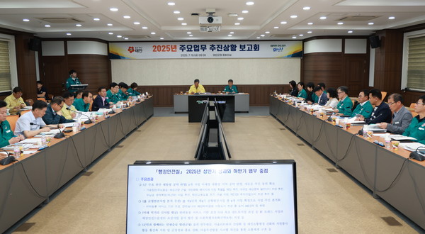 태안군(군수 가세로)은 지난 18일 군청 중회의실에서 가세로 군수와 부군수, 부서장 등 공직자 50여 명이 참석한 가운데 ‘2025년 주요업무 추진상황 보고회’를 갖고 하반기 성공적 군정 운영 방향을 모색했다.