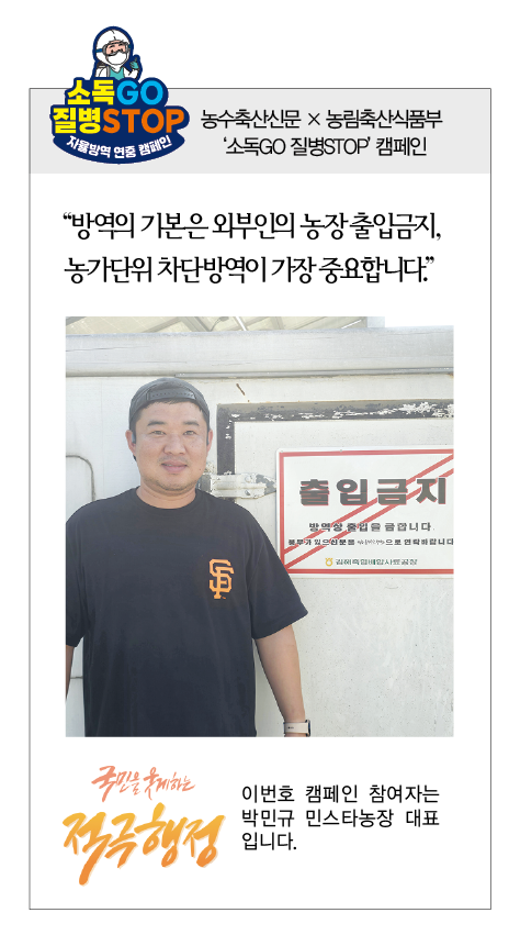 [농수축산신문=농수축산신문] 이번 호 캠페인 참여자는 박민규 민스타농장 대표입니다. 농수축산신문 webmaster@aflnews.co.kr 다른기사 보기 저작권자 © 농수축산신문 무단전재, 재배포 및 AI학습 이용 금지 당신만 안 본 뉴스 [AFL칼럼] ASF 백신 개발, ‘K-방역’의 새 지평 열까 서울 영등포농협 사회공헌실천재단, '가정의 달 이벤트' 경품 증정식 개최 예산군, ‘힐링·건강·나눔’으로 주민 삶의 질 높인다 영등포농협 사회공헌실천재단, 동작구 '사랑의 온도탑' 제막식 '1호 주자'로 나서 지역사회 온기 확산 물꼬 터 차기 농협 축산경제 대표이사 선거 3파전 영농형태양광, 임차농 보호장치 마련을…정부, 투기 방지법 ‘밑그림’ [Issue+] 2026 국제곡물시장 전망 [AFL칼럼] ASF 백신 개발, ‘K-방역’의 새 지평 열까 댓글삭제 삭제한 댓글은 다시 복구할 수 없습니다. 그래도 삭제하시겠습니까? 비밀번호 닫기 기사 댓글 0 댓글 접기 로그인 후 이용 가능합니다. 댓글 내용입력 비회원 로그인 이름 비밀번호 댓글 내용입력 댓글쓰기 계정을 선택하시면 로그인·계정인증을 통해 댓글을 남기실 수 있습니다. 회원 로그인 비회원 글쓰기 이름 비밀번호 자동등록방지 로그인 옵션 창닫기 주요기사 숭례문 앞에 모인 ‘유령농부’들…유기농업 2배 확대 결의 플랜티팜, 사우디 성지 메디나에 K-스마트팜 구축한다 산림경영지도 우수사례 최우수상에 이이섭 상주시산림조합 지도원 세포배양 인조축산물, 안전성 문제 여전히 화두 [Issue+] 지속가능한 농업은 우리의 사명...ESG 경영 발굴·확산 ‘주목’ [농수축산신문-수협중앙회 공동기획] 착용海요 구명조끼 안전海요 우리바다 ⑦ 제주시 이보라 조일호 선장