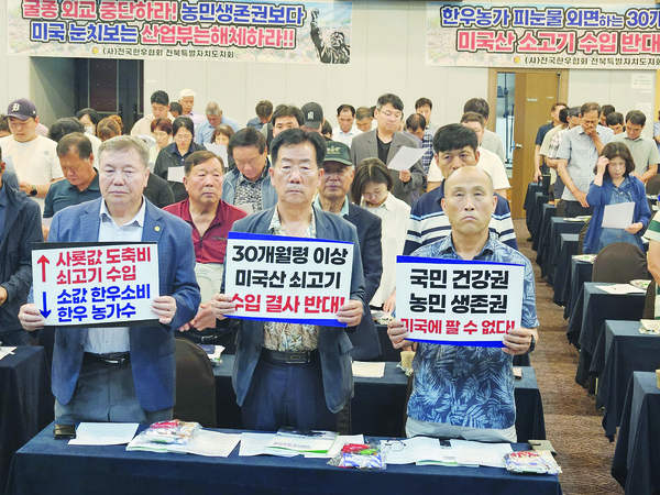 민경천 전국한우협회 회장은 “트럼프 정부의 30개월령 이상 소고기 수입 완화 요구와 이를 검토하고 있는 우리 정부의 처사에 한우농가는 분노하지 않을 수 없다”며 “정부는 국가안보인 식량자급률 확대를 위한 계획을 즉각 수립하고 농축산업의 고통과 희생을 당연시하는 산자부는 사죄하라”고 강조했다.