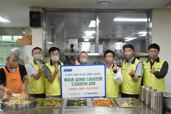 (사)나눔축산운동본부가 폭염이 지속되고 있는 복 시즌을 맞아 지난달 29일 서울 서초구 방배동 소재 ‘까리따스 사랑의 식당’을 비롯한 수도권 복지시설 7곳에 사랑의 축산물 정 나눔행사의 일환으로 농협목우촌 삼계탕을 전달했다.
