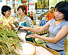 경기도 여주 하우스 논에서 재배된 햅쌀이 서울 양재동 농협하나로클럽 매장에 출하돼 소비자들의 발길을 잡고 있다. 이번에 출시된 햅쌀은 지난 3월에 모내기 해 난방으로 재배됐으며, 지난해보다 약 2주 정도 앞서 출하됐다.