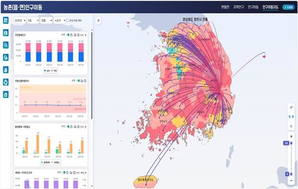 이번 농촌 인구이동 콘텐츠는 행정안전부 주민등록인구통계를 기반으로 단순한 인구 구조의 수치화가 아닌 시계열 변화, 인구이동 흐름, 공간 분포 등을 시각화해 통합적으로 제공, 인구 구조의 특성을 한눈에 더 입체적으로 분석한 정보를 제공하도록 설계됐다.