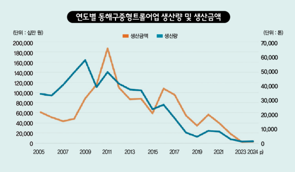 극단적인 조업부진으로 어려움을 호소하는 대표적인 업종은 동해구중형트롤어업이다. 오징어를 주로 어획하는 동해구중형트롤어업의 생산량은 2005년 3만63톤에서 2009년 5만7400톤으로 늘었다. 하지만 44년 만에 연근해어어업 생산량이 100만 톤을 하회했던 2016년에는 2만6473톤으로 줄었고 2018년에는 7448톤까지 감소했다. 2022년부터는 어업인들이 조업부진을 이유로 출어를 포기하는 지경에 이르면서 2022년 2725톤, 2023년 1233톤, 지난해 1424톤 등을 기록했다. 최근 20년 중 어획량이 가장 많았던 2009년에 비하면 어획량이 98% 가량 감소했다.