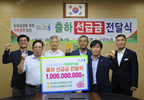 김동배 조합장은 “인구감소와 고령화 등으로 농촌 농협이 어려움을 겪고 있는 시기에 수륜농협에 출하선급금을 지원하게 돼 기쁘다”며 “앞으로도 도시와 농촌이 함께 균형 있는 발전을 할 수 있도록 최선을 다하겠다”고 말했다.