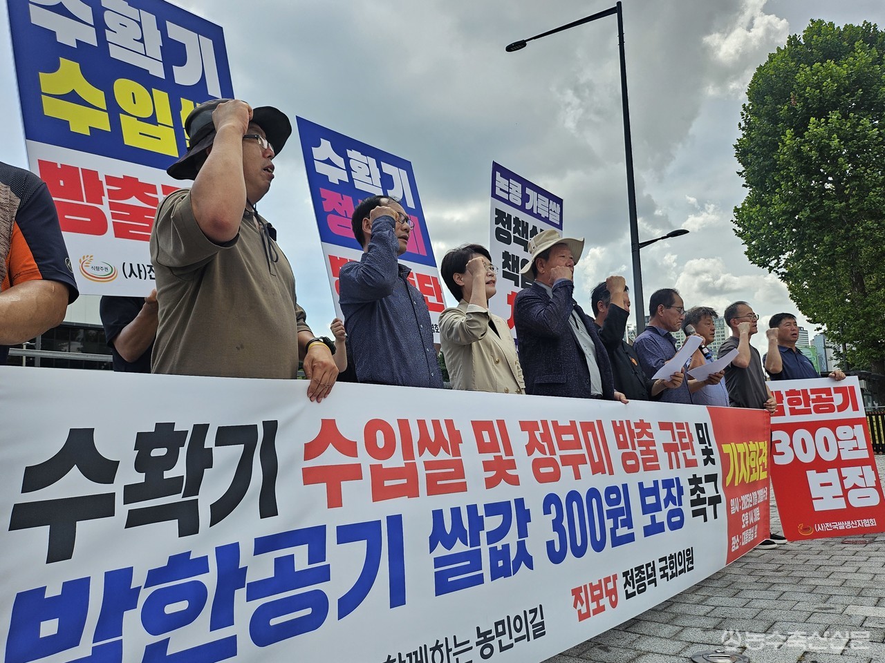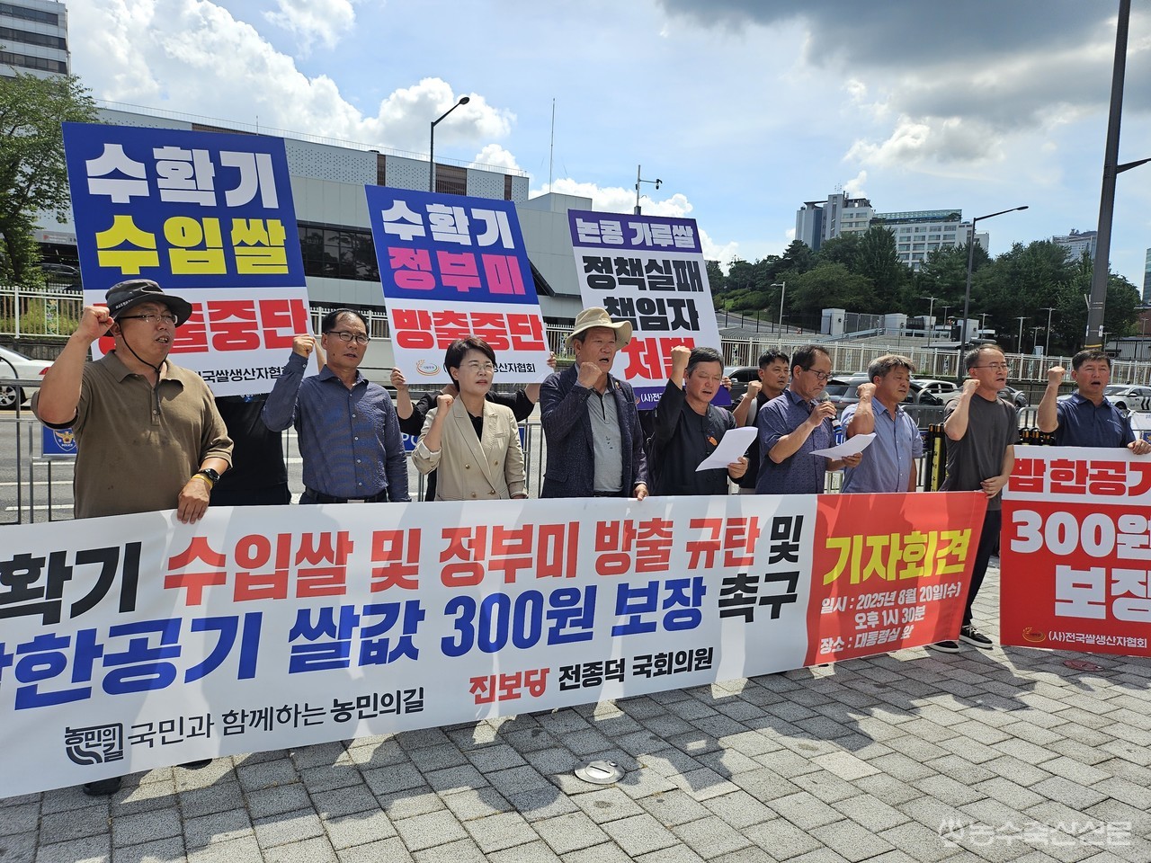 지난 20일 국민과 함께하는 농민의길과 전종덕 의원(진보당, 비례)은 서울 용산 대통령집무실 인근에서 ‘수확기 수입쌀·정부미 방출 규탄과 밥 한 공기 쌀값 300원 보장 촉구 기자회견 및 비상시국 농성’을 개최했다.