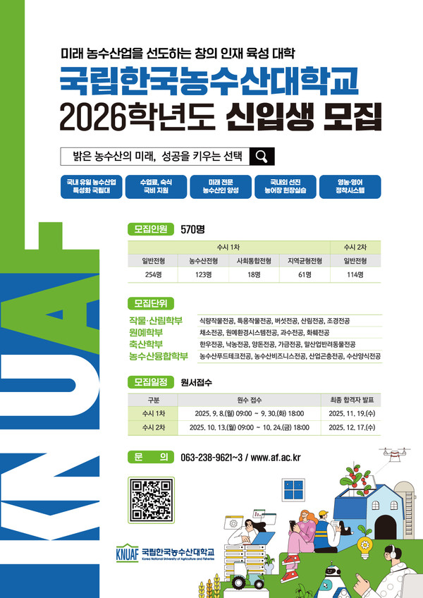 국립한국농수산대학교는 다음 달 8일 수시 1차 원서접수를 시작으로 2026학년도 신입생 570명 선발 절차를 개시한다.