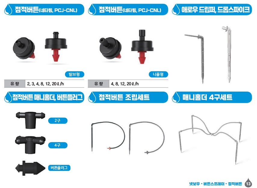 점적버튼조립세트는 점적버튼(PCJ-CNL), 애로우 드립퍼, 드롭스파이크 등으로 구성된 통합형 관수 장치다. 모듈형 시스템으로 작물 재배 형태에 따라 자유롭게 구성할 수 있으며 육묘장·포트 재배·베드형 시설 등에 안정적인 급수 환경을 제공한다.