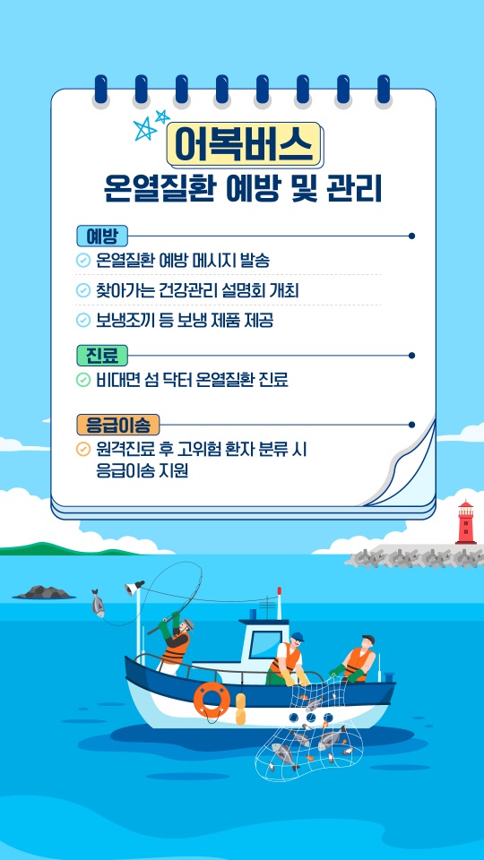 해양수산부는 여름철 폭염에 따른 어업인의 온열질환 발생 예방 등을 위해 ‘어복버스’ 사업 온열질환 특별관리기간을 이달까지 1개월 연장운영한다고 밝혔다.