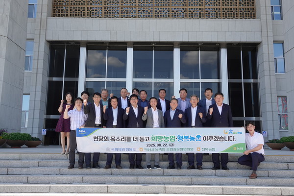 농협전북본부(총괄본부장 이정환)와 농협익산시지부(지부장 진현욱)는 최근 국회를 방문해 익산시 지역구 국회의원이자 국회 예산결산특별위원회 위원장인 한병도 의원과 함께 ‘농심천심 간담회’를 진행하고 익산 지역 농업 발전을 위한 주요 현안을 건의했다.
