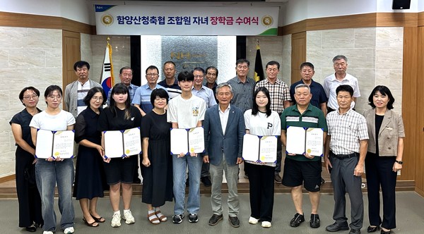 함양산청축협(조합장 박종호)은 지난달 27일 조합 본점 3층 회의실에서 조합원 자녀 장학금 수여식을 열고 함양·산청지역의 조합원 자녀 21명에게 1인당 100만 원씩 총 2100만 원의 장학금을 전달했다.