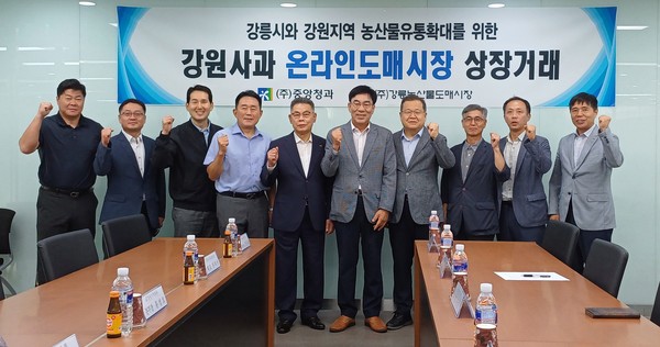 중앙청과는 3일 서울 가락시장 내 사무실에서 강릉농산물도매시장 관계자들과 간담회를 갖고 온라인 도매시장을 이용한 강릉사과 유통을 시작한다고 밝혔다. 이번 유통은 지난 7월 맺은 ‘강원사과 온라인도매시장 상장거래 상호 업무협약(MOU)’의 일환으로 추진하게 됐다.
