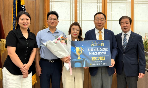 NH농협생명 부산총국(총국장 양기석)은 3일 명지농협(조합장 문웅섭) 본점을 방문해 ‘치료비안심해2NH건강보험’ 부산 1호 가입에 대한 감사 행사를 열었다.
