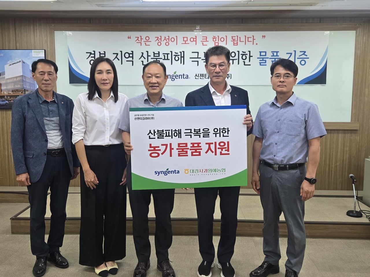 신젠타코리아는 지난 1일 대경사과원예농협 본점 회의실에서 이홍부 신젠타코리아 경북지점장과 류영재 대경사과원예농협 구매사업본부장을 비롯해 이경원 상임이사, 이현록 지도관리본부 상무 등이 참석한 가운데 대구·경북 산불 피해 농업인들을 위한 구호물품 전달식을 가졌다.