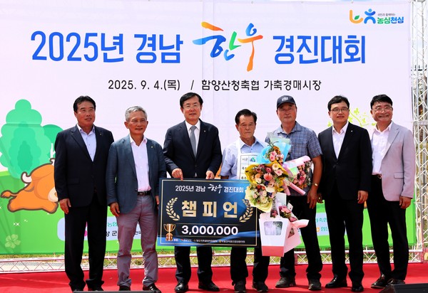 농협경남본부(본부장 류길년, 이하 경남농협)가 주최·주관하고 경상남도와 한우자조금 관리위원회, 전국한우협회 등이 후원하는 ‘2025년 경남한우경진대회’가 4일 함양산청축협(조합장 박종호) 가축경매시장에서 열렸다.