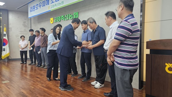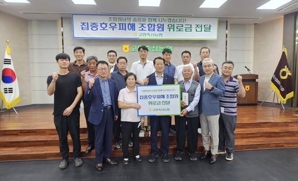 경기 고양축산농협(조합장 유완식)은 지난달 29일, 7월 경기북부 폭우피해로 주택, 축사침수 피해를 입은 조합원들에게 재해위로금을 전달했다.