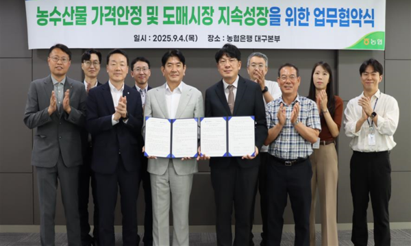 대구농수산물유통관리공사(사장 김상덕)는 지난 4일 NH농협은행 대구본부(본부장 손영민)와 ‘농수산물 가격안정과 도매시장 지속 성장을 위한 업무협약(MOU)’을 체결했다.