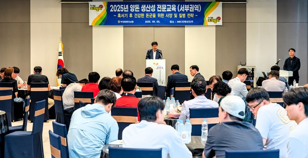 부경양돈농협(조합장 이재식) 양돈종합지원실은 조합원의 농장 경영 안정과 생산성 향상을 위해 권역별 ‘2025년 양돈 생산성 전문교육’을 개최했다. 이번 교육은 두차례로 나눠 지난 3일 진주 MBC컨벤션(서부권역)과 5일 김해 JW웨딩컨벤션센터(동부권역)에서 열렸으며, 권역별로 각각 100여 명의 조합원이 참석해 성황을 이뤘다.