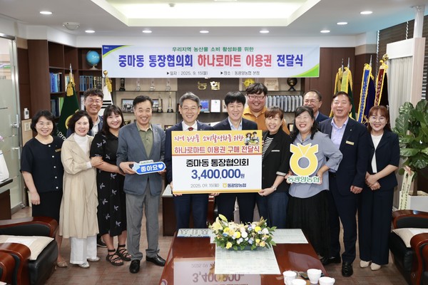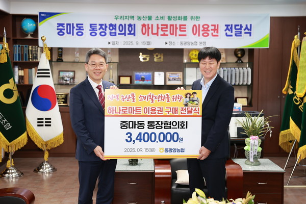 이에 공감한 중마동통장협의회는 지난해에 이어 올해도 지역 농가 지원에 힘을 보태기 위해 동광양농협 하나로마트 이용권 340만 원어치를 구입했으며 동광양농협은 지난 15일 감사의 마음을 담아 전달식을 가졌다.