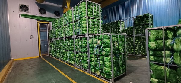 관리자의 손짓에 따라 거대한 저장고 문이 열리자 서늘한 냉기가 흘러나왔다. 안에서는 막 수확한 배추가 차례로 예냉 과정을 거치며 장기 저장을 준비하고 있었다.