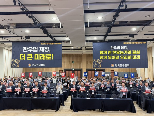 지난 11일 대구 엑스코에서 열린 ‘전국한우협회 창립 26주년 기념식’에 참석한 한우농가들이 한우산업의 새로운 도약을 다짐하는 ‘한우농가 결의대회’를 진행하고 있다.