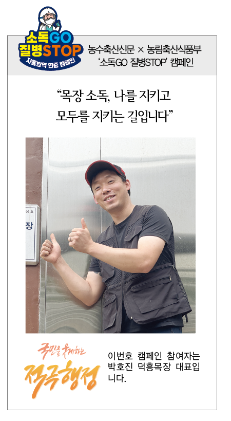 [농수축산신문=농수축산신문] 이번호 캠페인 참여자는 박호진 덕흥목장 대표입니다. 농수축산신문 webmaster@aflnews.co.kr 다른기사 보기 저작권자 © 농수축산신문 무단전재, 재배포 및 AI학습 이용 금지 당신만 안 본 뉴스 [AFL칼럼] ASF 백신 개발, ‘K-방역’의 새 지평 열까 서울 영등포농협 사회공헌실천재단, '가정의 달 이벤트' 경품 증정식 개최 예산군, ‘힐링·건강·나눔’으로 주민 삶의 질 높인다 영등포농협 사회공헌실천재단, 동작구 '사랑의 온도탑' 제막식 '1호 주자'로 나서 지역사회 온기 확산 물꼬 터 차기 농협 축산경제 대표이사 선거 3파전 영농형태양광, 임차농 보호장치 마련을…정부, 투기 방지법 ‘밑그림’ [Issue+] 2026 국제곡물시장 전망 [AFL칼럼] ASF 백신 개발, ‘K-방역’의 새 지평 열까 댓글삭제 삭제한 댓글은 다시 복구할 수 없습니다. 그래도 삭제하시겠습니까? 비밀번호 닫기 기사 댓글 0 댓글 접기 로그인 후 이용 가능합니다. 댓글 내용입력 비회원 로그인 이름 비밀번호 댓글 내용입력 댓글쓰기 계정을 선택하시면 로그인·계정인증을 통해 댓글을 남기실 수 있습니다. 회원 로그인 비회원 글쓰기 이름 비밀번호 자동등록방지 로그인 옵션 창닫기 주요기사 숭례문 앞에 모인 ‘유령농부’들…유기농업 2배 확대 결의 플랜티팜, 사우디 성지 메디나에 K-스마트팜 구축한다 산림경영지도 우수사례 최우수상에 이이섭 상주시산림조합 지도원 세포배양 인조축산물, 안전성 문제 여전히 화두 [Issue+] 지속가능한 농업은 우리의 사명...ESG 경영 발굴·확산 ‘주목’ [농수축산신문-수협중앙회 공동기획] 착용海요 구명조끼 안전海요 우리바다 ⑦ 제주시 이보라 조일호 선장