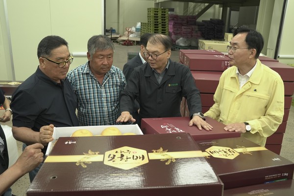 윤병태 나주시장이 추석 명절을 앞두고 배 출하 현황을 점검하고 현장 관계자들을 격려했다.