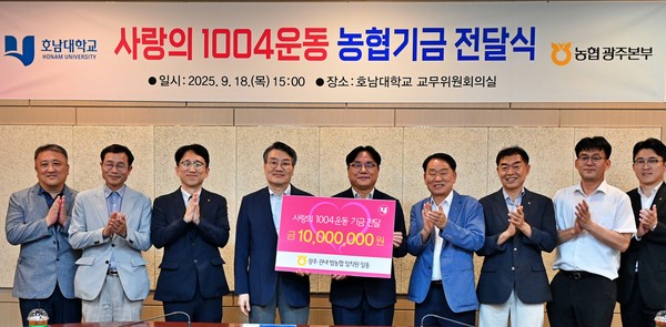 농협광주본부(본부장 이현호)는 지난 18일 호남대학교 본관에서 경제적으로 어려운 학생들을 돕기 위해 ‘사랑의 1004운동’ 기금 1000만 원을 전달했다고 밝혔다.