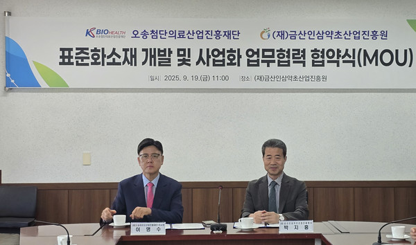 금산인삼약초산업진흥원(원장박지홍)과 오송첨단의료산업진흥재단(KBIOHealth·이사장 이명수)은 지난 19일 고유 천연물 유래 식·의약 융합 표준화 소재 기술개발과 글로벌 식·의약 산업 발전, 지역 산업 활성화를 위한 업무협약(MOU)을 체결했다.