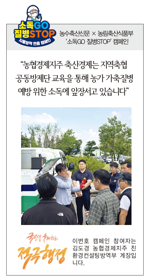 [농수축산신문=농수축산신문] 이번호 캠페인 참여자는 김도경 농협경제지주 친환경컨설팅방역부 계장입니다. 농수축산신문 webmaster@aflnews.co.kr 다른기사 보기 저작권자 © 농수축산신문 무단전재, 재배포 및 AI학습 이용 금지 당신만 안 본 뉴스 [AFL칼럼] ASF 백신 개발, ‘K-방역’의 새 지평 열까 서울 영등포농협 사회공헌실천재단, '가정의 달 이벤트' 경품 증정식 개최 예산군, ‘힐링·건강·나눔’으로 주민 삶의 질 높인다 영등포농협 사회공헌실천재단, 동작구 '사랑의 온도탑' 제막식 '1호 주자'로 나서 지역사회 온기 확산 물꼬 터 차기 농협 축산경제 대표이사 선거 3파전 영농형태양광, 임차농 보호장치 마련을…정부, 투기 방지법 ‘밑그림’ [Issue+] 2026 국제곡물시장 전망 [AFL칼럼] ASF 백신 개발, ‘K-방역’의 새 지평 열까 댓글삭제 삭제한 댓글은 다시 복구할 수 없습니다. 그래도 삭제하시겠습니까? 비밀번호 닫기 기사 댓글 0 댓글 접기 로그인 후 이용 가능합니다. 댓글 내용입력 비회원 로그인 이름 비밀번호 댓글 내용입력 댓글쓰기 계정을 선택하시면 로그인·계정인증을 통해 댓글을 남기실 수 있습니다. 회원 로그인 비회원 글쓰기 이름 비밀번호 자동등록방지 로그인 옵션 창닫기 주요기사 숭례문 앞에 모인 ‘유령농부’들…유기농업 2배 확대 결의 플랜티팜, 사우디 성지 메디나에 K-스마트팜 구축한다 산림경영지도 우수사례 최우수상에 이이섭 상주시산림조합 지도원 세포배양 인조축산물, 안전성 문제 여전히 화두 [Issue+] 지속가능한 농업은 우리의 사명...ESG 경영 발굴·확산 ‘주목’ [농수축산신문-수협중앙회 공동기획] 착용海요 구명조끼 안전海요 우리바다 ⑦ 제주시 이보라 조일호 선장