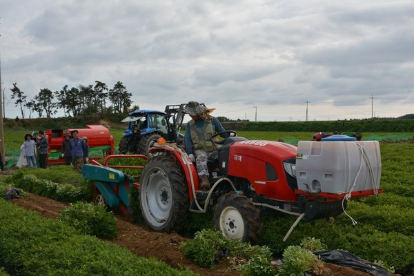 지난 22일 자은도에서 신품종 ‘해올’, ‘케이올2호’ 기계수확 연시회 개최