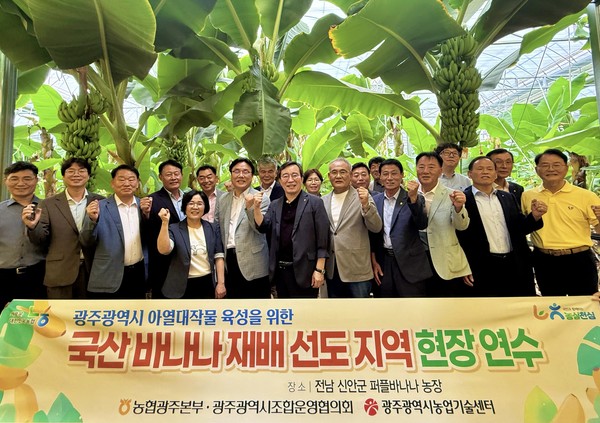 농협광주본부(본부장 이현호)는 지난 22일 광주광역시 조합운영협의회(의장 김명열)주관으로 광주광역시 농업기술센터(소장 김시라)와 함께 전남도 신안군에 위치한 퍼플 바나나 농장을 방문해 국내 아열대작물육성 선도지역 현장연수를 진행했다고 밝혔다.