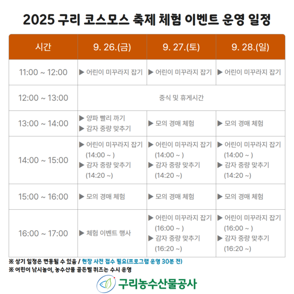 구리농수산물공사(사장 김진수)는 오는 26일부터 28일까지 구리 한강시민공원에서 열리는 ‘2025 구리 코스모스 축제’에서 구리농수산물도매시장의 특색을 알릴 수 있는 체험형 홍보부스를 운영할 계획이다.