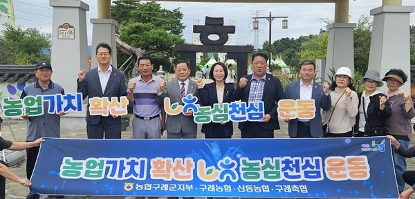이날 행사엔 전남본부 부본부장, 농협구례군지부장, 구례군의원, 새농민회원 등이 함께 했다. 송해경 지부장은 “이번 ‘농심천심 운동’ 은 과거 농협이 추진했던 ‘신토불이·농도불이 운동’을 계승·발전한 것”이라며 “관내 농축협·유관기관 등과 함께 이 운동 홍보를 적극 펼쳐 농업·농촌의 발전에 앞장서는 농업협동조합의 역할을 수행해 나가겠다” 말했다.