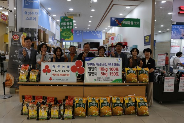 제주 서귀포 중문농협(조합장 김성범)은 지난 22일 익명의 복지 후원자로부터 일반미 5kg 150포와 10kg 100포, 총 1750kg 상당의 쌀을 기부 받아 제주사회복지공동모금회(회장 강지언)에 나눔 했다.