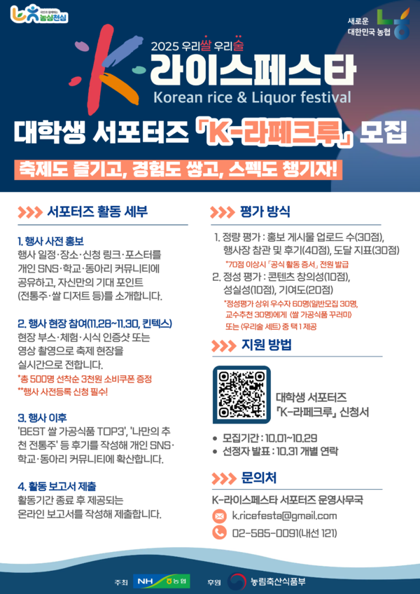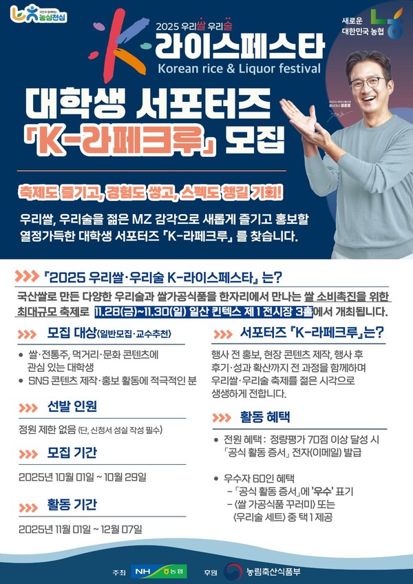 장지윤 농협경제지주 식품지원부장은 “K-라페크루 활동은 대학생들이 직접 우리쌀과 우리술의 가치를 알리는 주인공이 돼 축제를 즐기고 스펙도 챙길 수 있는 기회가 될 것”이라며 “MZ세대의 톡톡 튀는 아이디어와 열정을 기다린다”고 말했다.