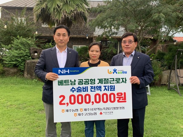 농협제주본부(본부장 고우일)와 제주고산농협(조합장 고영찬)은 지난 2일 제주고산농협 본점에서 공공형 계절근로자 팜티응아(38, 여)씨의 수술비 전액을 지원하는 전달식을 개최했다.