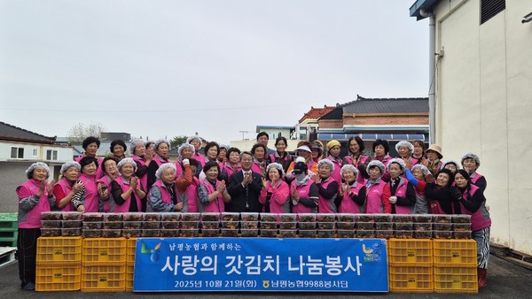 나주 남평농협(조합장 신광섭)은 지난 21일 9988봉사단원 60여 명(단장 안귀자)이 참여한 가운데 갓김치 120단을 직접 담가 지역내 홀로 사는 336가구의 독거어르신들에게 1통씩(2.7kg)을 전달하는 가을 갓김치 나눔행사를 진행했다.