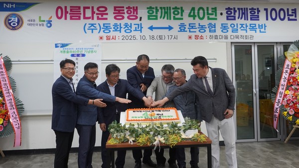 동화청과는 지난 18일 제주도 서귀포시 하효마을 다목적회관에서 ‘효돈농협 동일작목반 계통출하 40주년 기념행사’에 참석해 그동안의 상생 여정을 축하했다.
