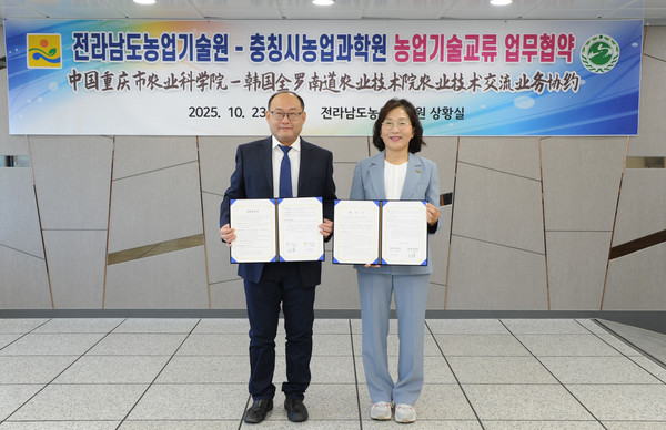 전남도농업기술원(원장 김행란)은 지난 23일 ‘2025국제농업박람회장’에서 중국 충칭시농업과학원(원장 구샤오홍)과 농산업 기술교류를 위한 업무협약을 체결했다고 밝혔다.
