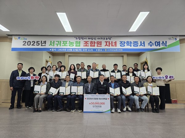 제주 서귀포농협(조합장 정기철)은 지난 23일 조합 본점 3층 대회의실에서 ‘2025년 조합원 자녀 장학증서 수여식’을 개최했다.