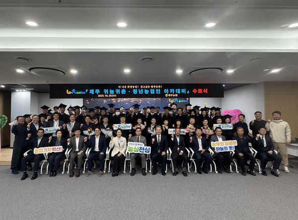 농협제주본부(본부장 고우일)는 지난 29일 제주본부 대회의실에서 귀농귀촌·청년농업인 아카데미 교육생과 농협관계자 100여 명이 참석한 가운데 ‘2025년 제주 귀농귀촌·청년농업인 아카데미 수료식’을 개최했다.